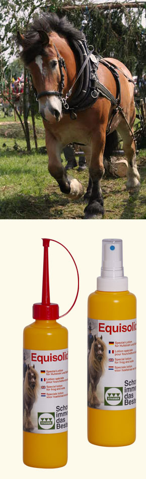 Equisolid verklebt und verstopft die Hornporen nicht, wie dieses z.B. bei der Verwendung von Teer der Fall ist. Es entsteht ein natürlicher Schutz vor schädlichen Einflüssen wie Feuchtigkeit oder reizendem Stallmist. Equisolid eignet sich nicht nur zur Pflege des Hufstrahls, es kann auch zur Festigung der gesamten Hufsohle verwendet werden. Auch in Fällen, wo die weiße Linie porös oder morsch ist, kann Equisolid oft mit gutem Erfolg angewendet werden. Die Praxis hat gezeigt, dass Pferde, bei denen wegen schlechter Hornqualität die Eisen nicht halten, häufig wieder problemlos beschlagen werden können.